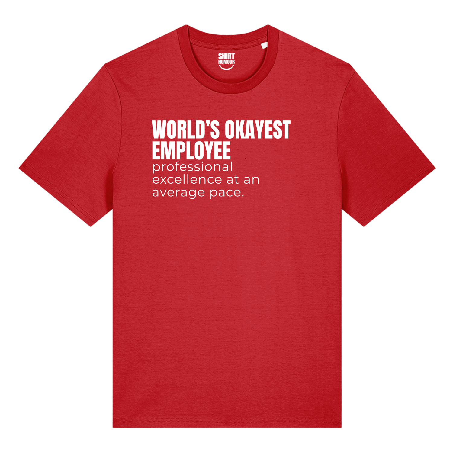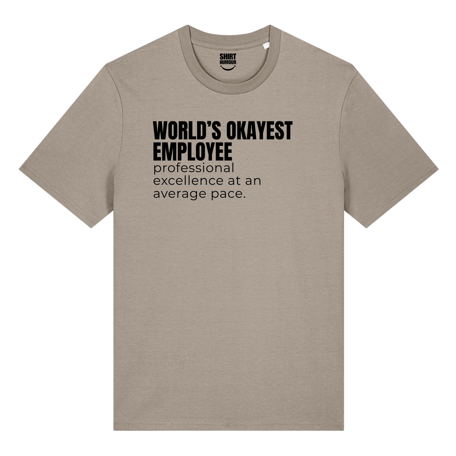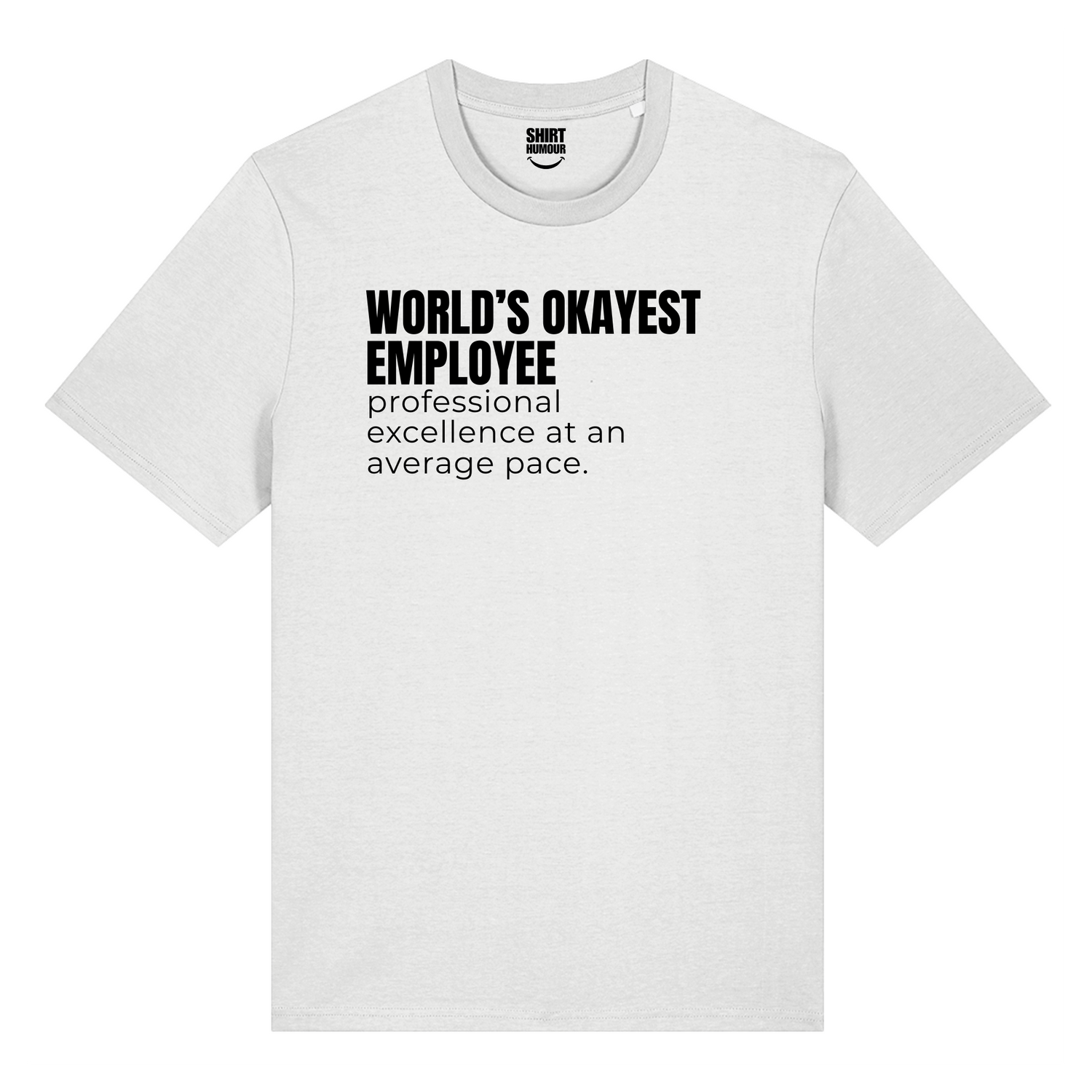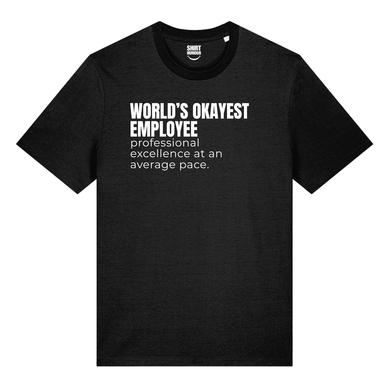 Say it with sarcasm. This minimalist text tee says it better than most people can: "World's Okayest Employee, professional excellence at an average pace.." Printed to order in the UK on a premium Stanley/Stella Creator tee, it's soft, sustainable, and always hilarious.